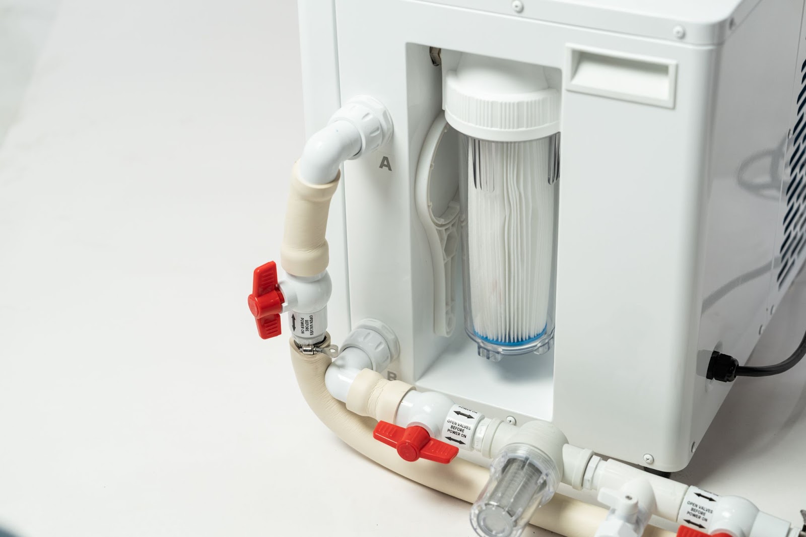 - Attach Connection A to the chiller and bring it down into an “L” shape in order to not restrict filter access.The connections are flexible and designed to bend this way, but please be careful not to kink the hose which will restrict flow.